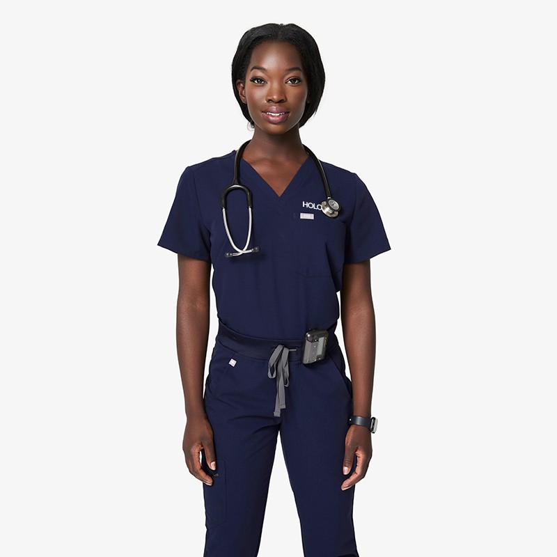 HOLOGIC logo embroidered left chest. Top features one functional pocket (chest pocket), slim fit, modern v-neck, darted back and side-slit hem, Engineered with Technical Comfortâ„¢. Features our proprietary FIONx fabric with Silvadurâ„¢ antimicrobial technology for odor control and fabric durability and four-way stretch, moisture-wicking, anti-wrinkle and ridiculously soft properties.