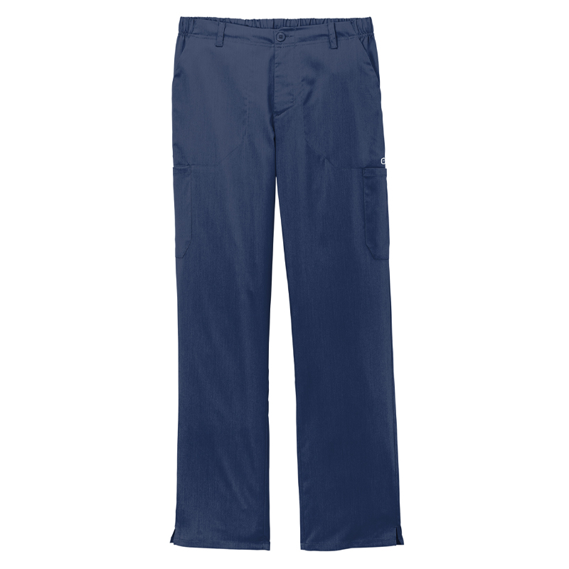 78/20/2 poly/rayon/spandex. Flat front waistband with belt loops. Full drawstring waist with elastic back. Button opening with zipper fly. Front slash pockets. Cargo pockets with interior pocket. Single back pocket. Straight leg. Side vents. WonderWink heat transfer logo at front left pocket. Modern fit. 31-inch inseam.